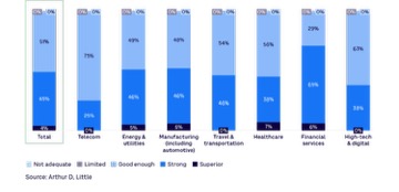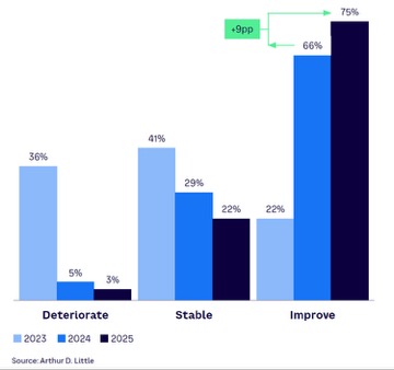 Según estudio realizado por Arthur D. Little el 97% espera que las perspectivas económicas mundiales mejoren o se mantengan estables en los próximos tres a cinco años (véase la Figura 1). Tres cuartas partes (75%) creen que mejorarán. Esta actitud positiva es aún mayor entre las empresas con una facturación superior a 10.000 millones de dólares, donde el 82% prevé mejoras, frente al 73% de las que se encuentran en el rango de
