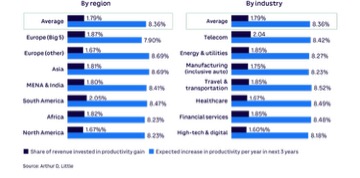 En todos los sectores, regiones y tamaños de empresa, los directores ejecutivos buscan invertir en entre el 1 % y el 2 % de sus ingresos en iniciativas de mejora del rendimiento para lograr un aumento anual de la productividad de alrededor del 8 % durante los próximos tres años.
